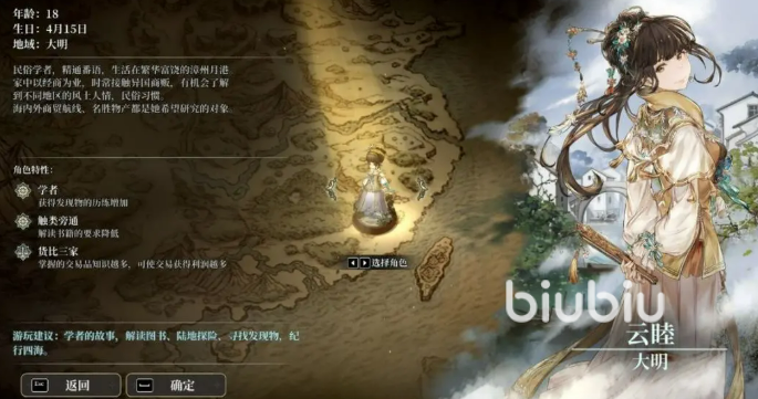 游戏初始提供四位可选主角,各自拥有独立出身设定与专属成长倾向。对首次接触该作的玩家而言,推荐优先选用云睦作为起始角色。其核心优势在于:起始活动区域位于东亚海域,地理参照系清晰,港口分布密度高,航线辨识门槛低;同时她的天赋能力与贸易知识积累深度绑定——每提升一级交易相关技能,后续单次货物利润率将获得稳定加成,为中后期规模化商业运营奠定基础。其余角色虽各具战术或探索特长,但综合容错率与学习曲线,云睦仍是新手最优解。