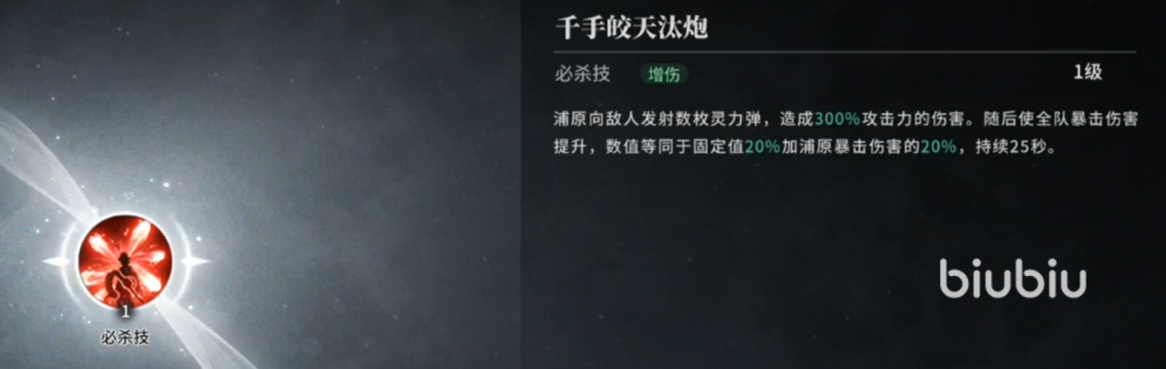 必杀技“千手皎天汰炮”是其核心团队增益手段:锁定目标发射高能光束,造成高额单体伤害的同时,为全队赋予暴击伤害提升效果,持续时间明确且稳定。这一机制使其成为爆发流阵容不可或缺的辅助支点,大幅提升队伍整体DPS上限。