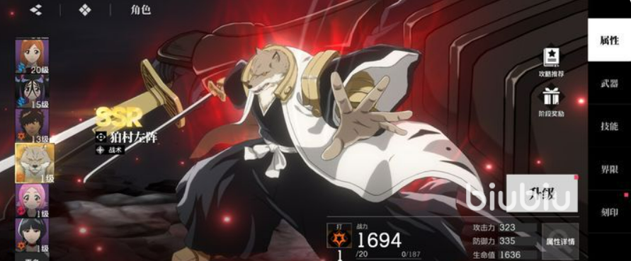 黑崎一护为SR品质角色,定位为高机动性近战输出。其普攻共四段,每段命中均可积累灵压值;一技能为直线突进斩击,命中后可衔接追加攻击,连招节奏流畅;二技能需灵压满格方可释放,具备大范围群体伤害,在副本清怪与竞技场压制场景中表现突出。完成卍解形态解锁后,整体伤害提升45%,并附加虚化状态效果,显著强化持续作战能力。