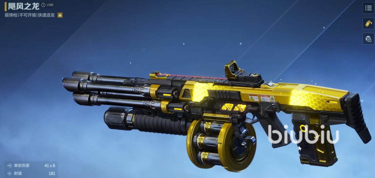 飓风之龙配备两个专属技能——主动技能“飓龙连击”与被动技能“炙热龙炎”。启用“飓龙连击”后,每次触发攻击动作(无论单点还是长按)均会自动完成4连发,且每发均同步消耗子弹与武器能量。这一设定改变了传统点射节奏,需玩家通过练习形成肌肉记忆。