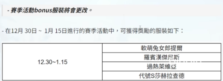 4、赛季皮肤有上线,在12月30日到1月15日期间,可获取软萌兔女郎提尔,罗宾汉杰尼斯,过热莱维亚以及代号S莎赫拉查德等等服装外观。