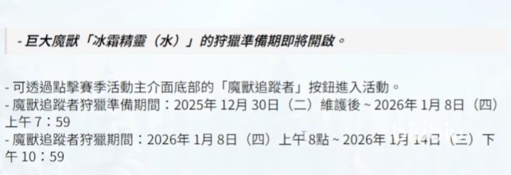 5、巨大魔兽【冰霜精灵】狩猎准备期即将开放,我们可以在赛季活动主界面的底部通过点击魔兽追踪者按钮进入,准备期为25.12.30日到26.1.8日,正式开始狩猎日期为26.1.8日到26.1.14日下午10:59,抓紧时间参加。