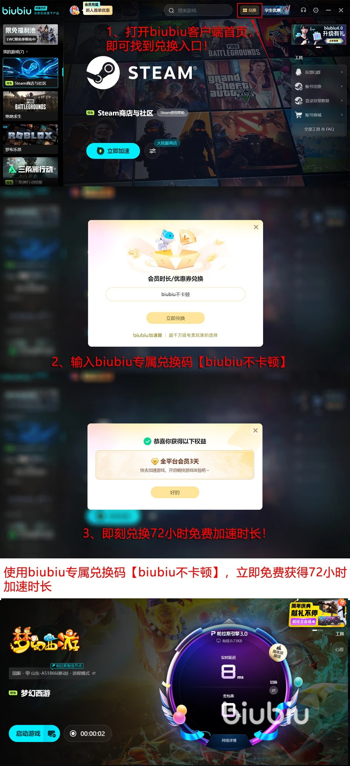 因为有着万千玩家的支持,biubiu不定时就会送出各种重磅福利,就好比现在新人来到biubiu加速器是有24小时免费加速体验的,再加上现在还有兑换码【biubiu不卡顿】领取72小时的活动,所以单是对新人来说叠加起来能得到96小时的加速时长,划重点!老用户现在回来输入兑换码也是能领取的哦,让你自己体验后再评判效果如何,以后大半夜挂机刷怪也不害怕会掉线啦。