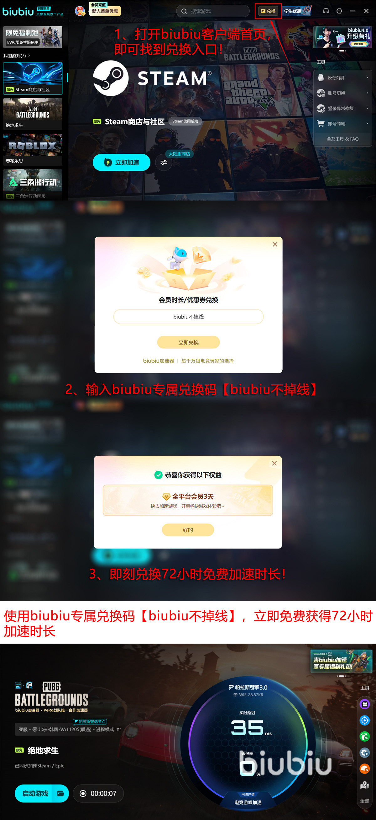 现在输【biubiu不掉线】直接拿3天,新号注册登录再送1天。一共能玩96小时,全是免费的。