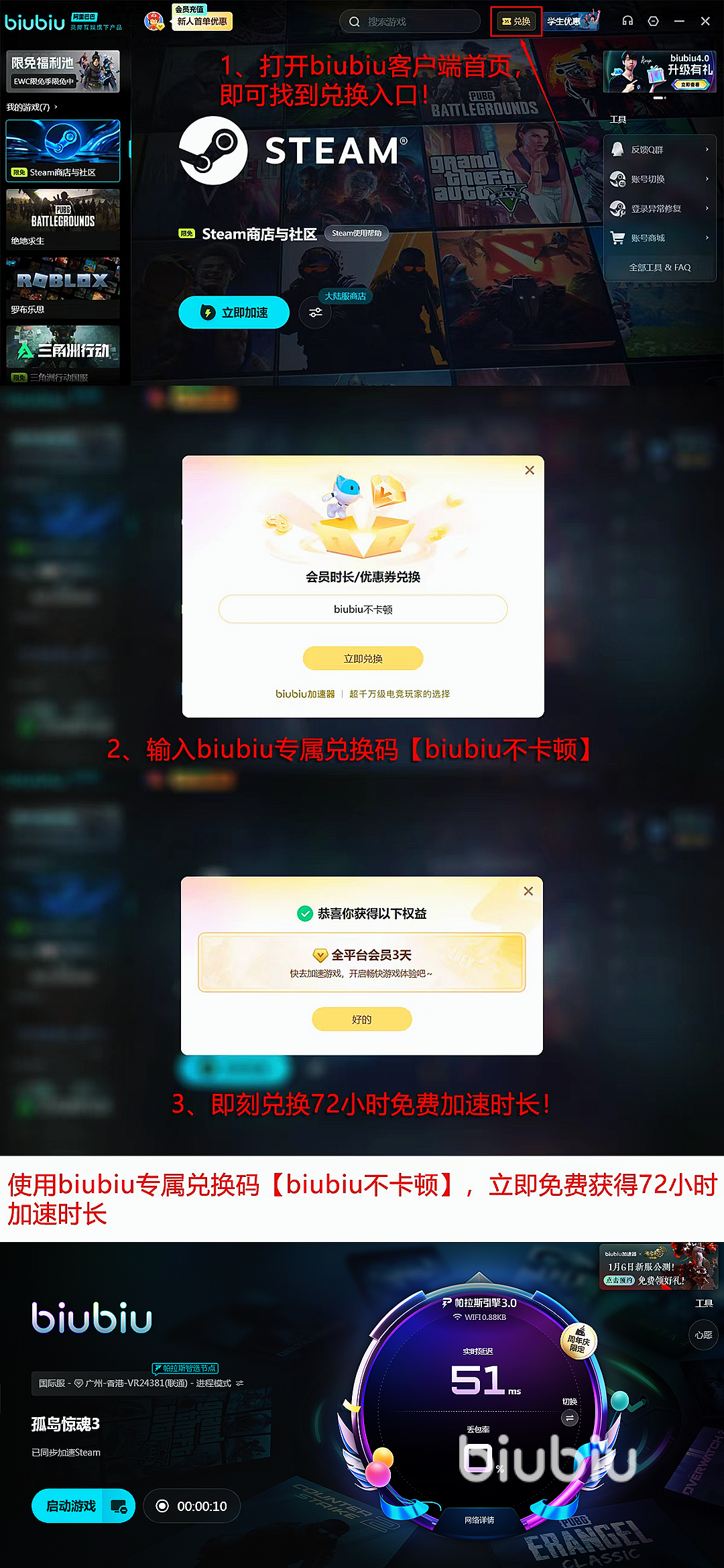 biubiu 加速器向来对老用户诚意满满,专属福利享不停!对新用户更是毫不吝啬,新人完成注册就能直接解锁24小时全场游戏免费加速特权,不管是热门大作还是小众精品,这段时间内搜索到的游戏都能畅快加速,全部用户输入兑换码【biubiu 不卡顿】,就能额外再领 3 天免费加速时长,轻松实现游戏畅玩自由!