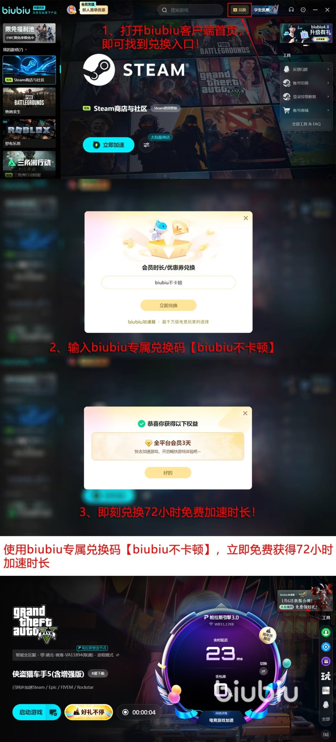 对于还在被闪退困扰的玩家,biubiu准备了一份贴心的入门礼,如果你是首次使用,注册成功后就能立刻拥有24小时的免费加速时间,让你有充足的时间去试用各项功能。而且平台还提供了一批兑换码【biubiu不卡顿】,所有用户都能使用这个码去兑换3天的试用时间,让你能零成本体验biubiu加速器。