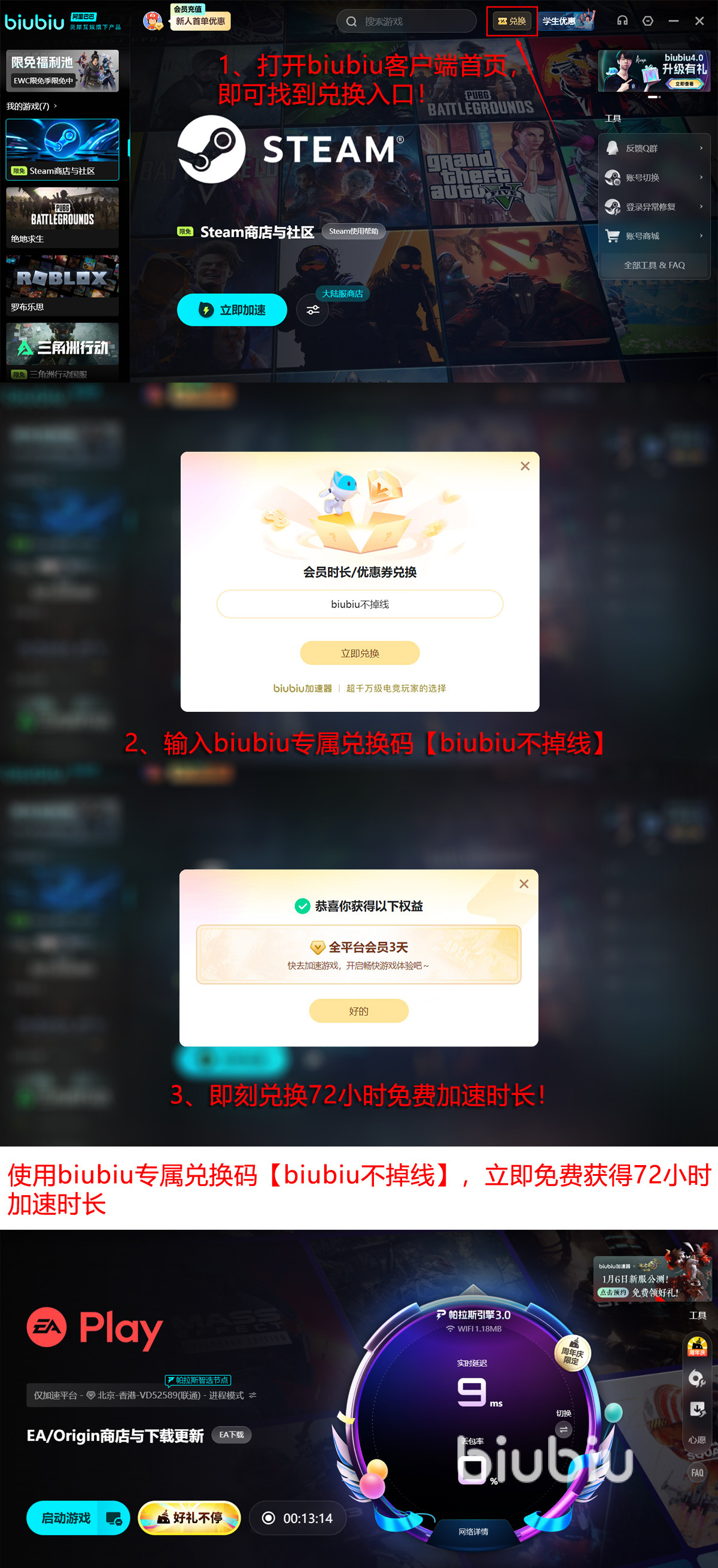 现在,新号注册直接领24小时提速时间,还能用【biubiu不掉线】再换3天,这样里外里加起来,起步就能白用96小时,足够你试个明白了。
