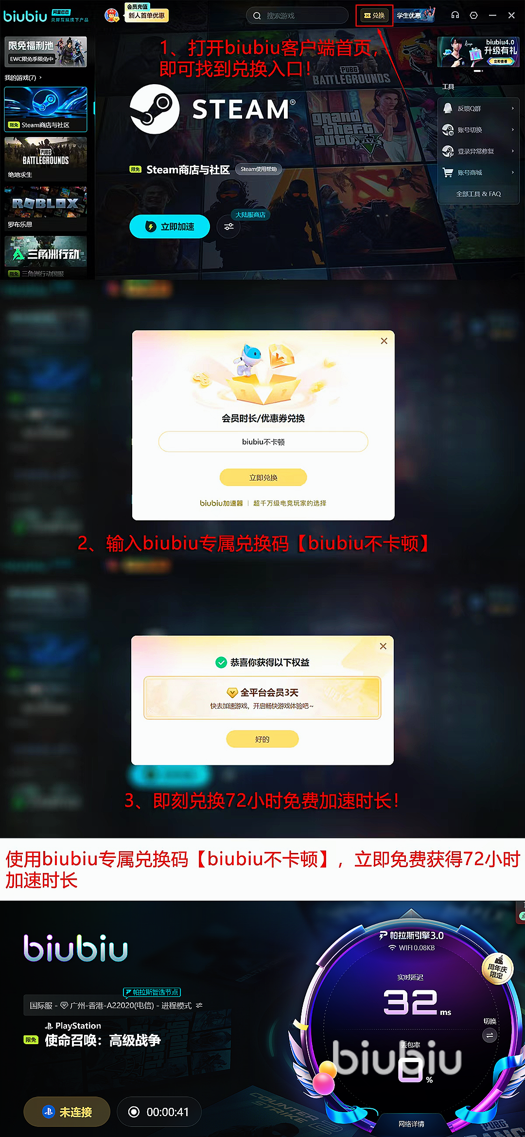 还有biubiu加速器对于新用户是超级友好的,新用户只要注册就可以24 小时全场游戏免费加速特权,加速期间所有游戏都可以选择,同时新老用户输入兑换码【biubiu 不卡顿】就能额外再领 3 天免费加速时长。