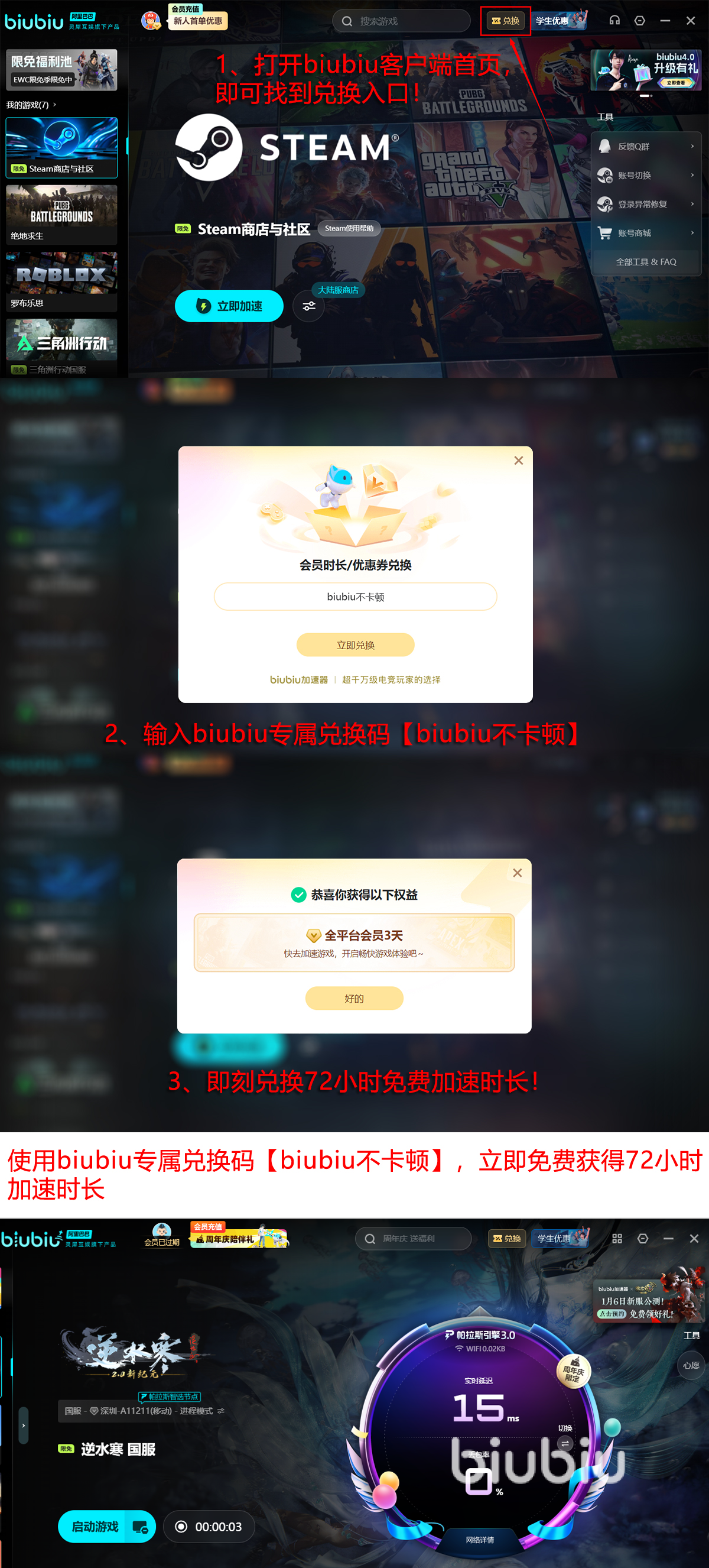 有的玩家想先试试能否解决卡顿问题,可以先注册,新人就能领取24H的免费加速。用过后,自然也就离不开这种加速效果了。此外,新老用户输入兑换码【biubiu不卡顿】,就能额外获取三天免费加速!所以新人可得96H的免费加速,可以在不同世界中游玩更久!