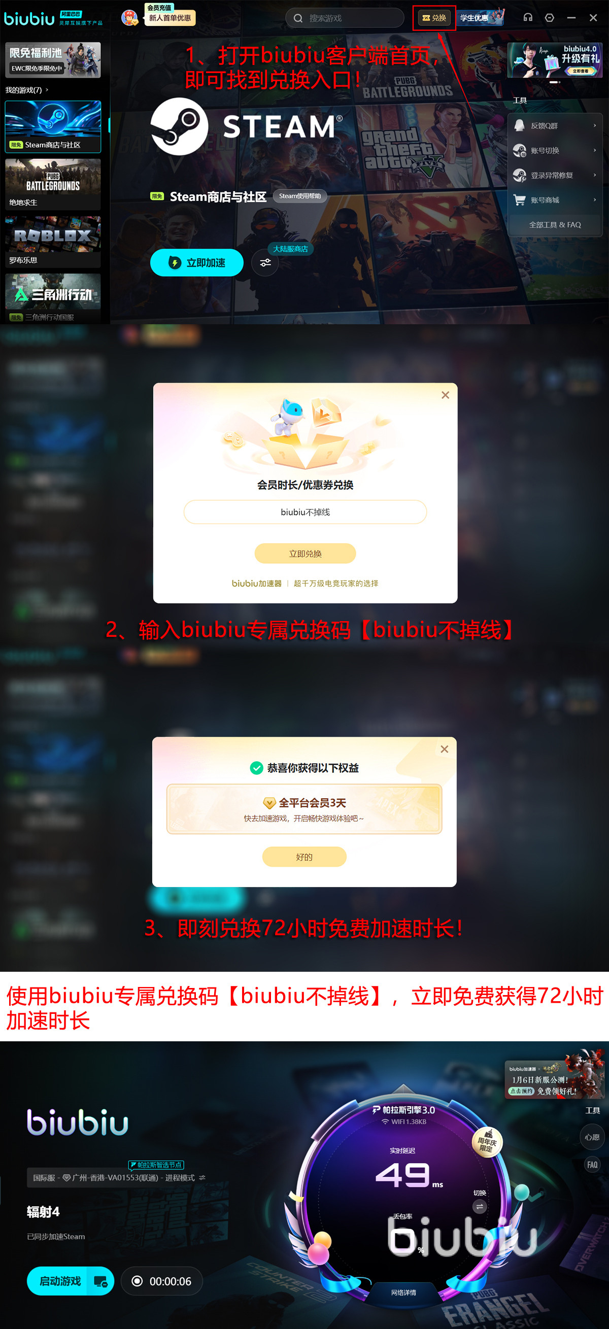 优质服务现在给大伙免费用的机会在呢,抓住福利领取才好,来到此的新人可以领取24h免费服务时间的,其余优惠也在等待领取中,用【biubiu不掉线】会再换到额外的72h时间用,一共新人可用96h的。biubiu的限免加速库为了庆祝冬促的到来,在12月18日到1月18日这段时间里,开放多项服务,买到游戏就能来找,而且steam平台也享受该服务的。