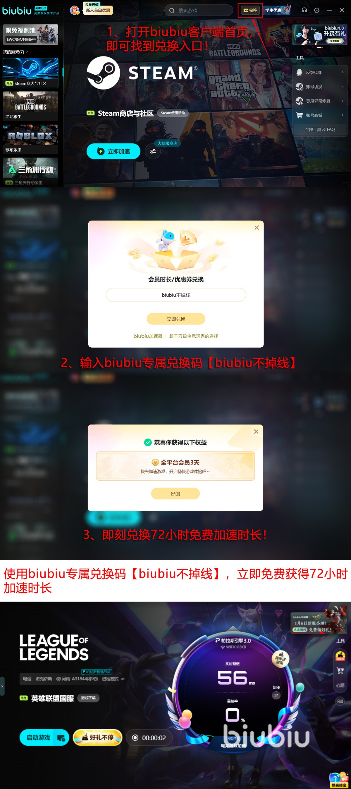 用户快速注册完成后,可享有首日全功能免费试用时长24小时,输入【biubiu不掉线】即可连续享有职业级流畅竞技体验72小时。以上两项权益叠加使用,可连续四天获得专业加速体验。