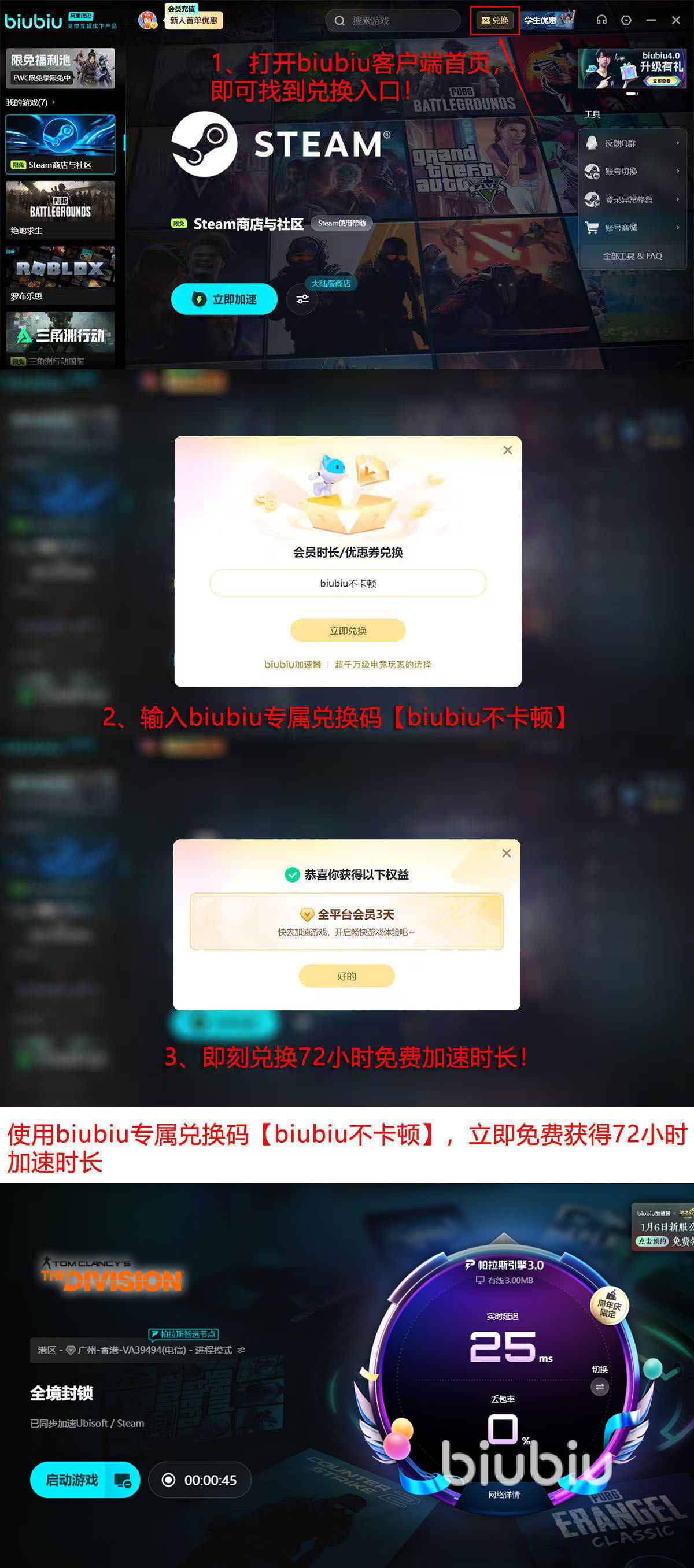 在网络经过加速器的优化处理后,无论是画面的流畅感,还是操控的使用感,大家在玩全境封锁的时候得到的体验,将绝对不同。当然,这里面也需要大家体验,正好现在有4天免费体验时间,这四天要分成2次领取,一是完成注册后得到的系统24小时免费时长,另外一个是,打开首页的“兑换”弹窗,然后在输入框里面输入【biubiu不卡顿】后,得到的 72小时免费时间,两者直接累积就是96小时了。