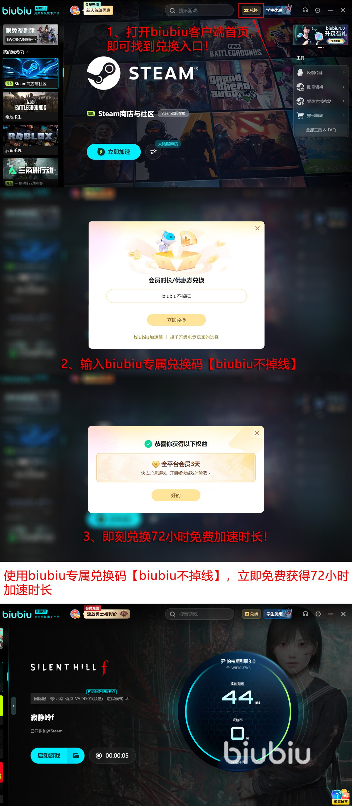 配合冬季促销节奏,biubiu加速器同步推出限时服务计划:12月18日至次年1月18日,用户可在指定限免加速池内无门槛使用全部加速功能。注册即享首日24小时自动试用权限;输入激活码【biubiu不掉线】,可额外获得72小时高级授权,总计96小时完整体验周期,充分覆盖通关所需时长。