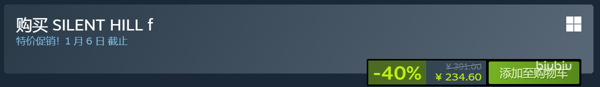 据Steam平台公开销售数据显示,《寂静岭F》标准版初始定价为391元人民币。在2025年12月启动的冬季特卖中,其售价下调至234.6元,折扣幅度达40%,刷新该作上线至今的最低成交纪录,亦为当前最大力度官方优惠。建议玩家重点关注每年两次大型周期性促销——夏季特卖与冬季特卖,以把握最具性价比的购入窗口期。