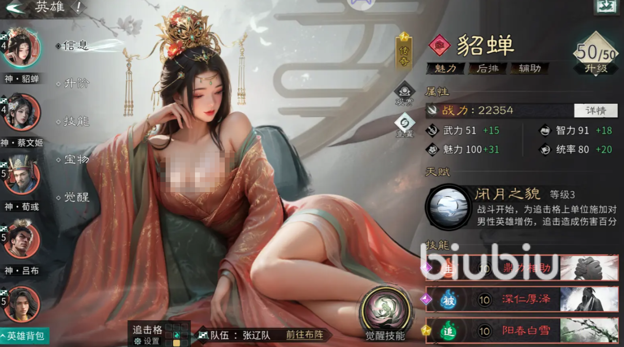首先需明确:貂蝉的技能生效前提是存活并处于安全输出环境。她不具备前排承伤能力,因此阵容前排必须配置具备高减伤、嘲讽或护盾机制的主坦武将。若前排抗压不足,貂蝉极易被集火秒杀,导致控制链中断、全队节奏崩盘。同时,队伍中应确保至少一名稳定治疗者(如华佗)或具备回血/免控能力的辅助,以维持中后期持久作战能力。换言之,貂蝉不是“单核C位”,而是需要被体系托举的战术支点。