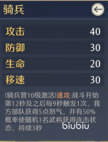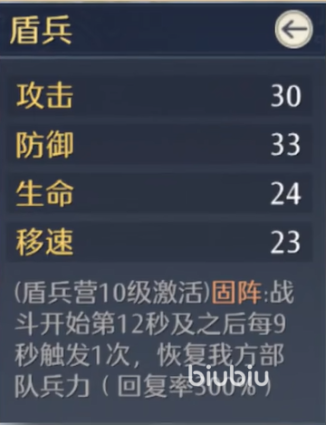 骑兵单位具备全兵种最高等级移速,适用于追击溃军、绕后突袭及切断补给线等高机动战术。完成骑兵营升级后,可解锁速攻特性,进一步强化其冲锋爆发力与切入效率。盾兵则拥有最高基础防御值,但移动迟缓;升级盾兵营后激活固阵效果,显著提升群体减伤能力,在持久消耗战中可大幅降低全队阵亡率,是构建稳固防线的战术支点。
