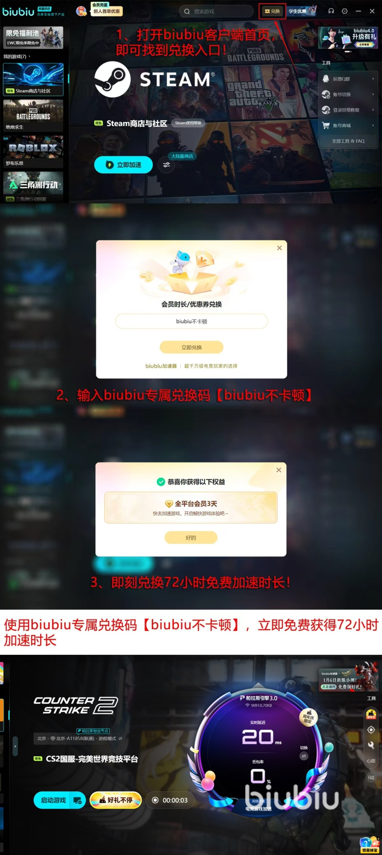 针对新用户顾虑的操作复杂性,该工具提供开箱即用体验:注册后自动获赠24小时全功能免费试用权限,可真实评估加速效果;所有用户(含已注册账号)输入兑换码【biubiu不卡顿】,即可即时激活额外72小时加速服务,无需绑定支付方式或完成额外任务。