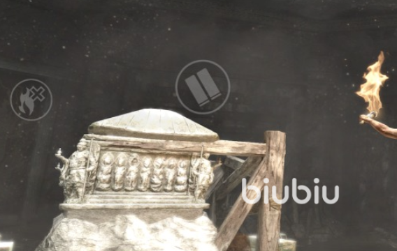 拾取宝物后绕行至瀑布后方,即抵达古墓入口。进入内部后需使用斧具进行垂直攀爬,登顶后点燃火把,沿通道前往营地,定位名为“劣民之坟”的目标地点。该区域陈列多具遗骸及铁制囚笼,需推动右侧笼体使其坠落,从而触发左侧金属平台的抬升机制。