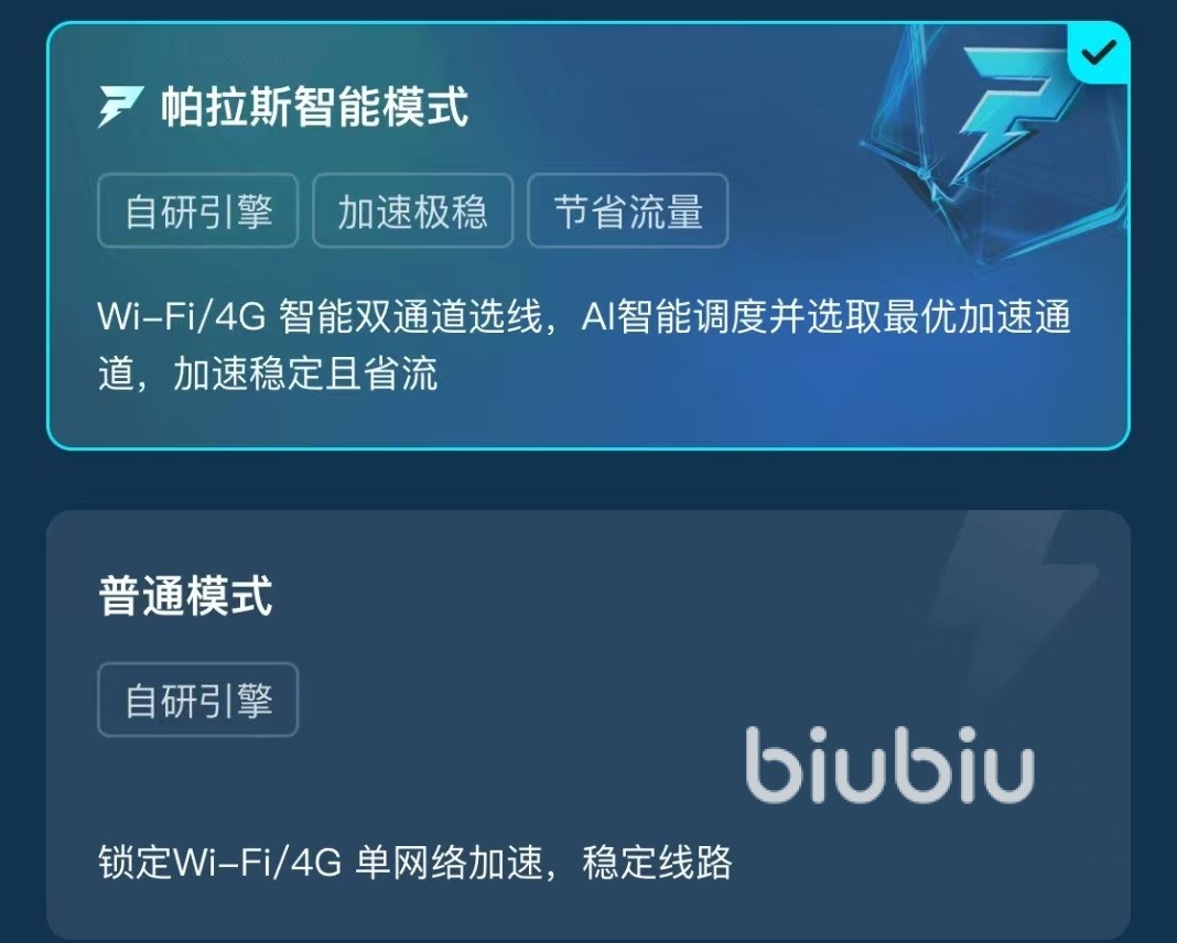 biubiu移动端提供双引擎加速架构:智能模式搭载自研帕拉斯引擎,支持Wi-Fi与移动数据自动优选线路,兼顾加速效率与流量控制;普通模式则锁定单一网络通道,适用于对连接一致性要求更高的场景。用户既可依据系统推荐启用,也可手动切换。值得注意的是,当前版本引入“视频激励机制”——观看指定短视频即可免费获取当日加速时长,大幅降低长期使用成本,适合高频游戏玩家日常部署。