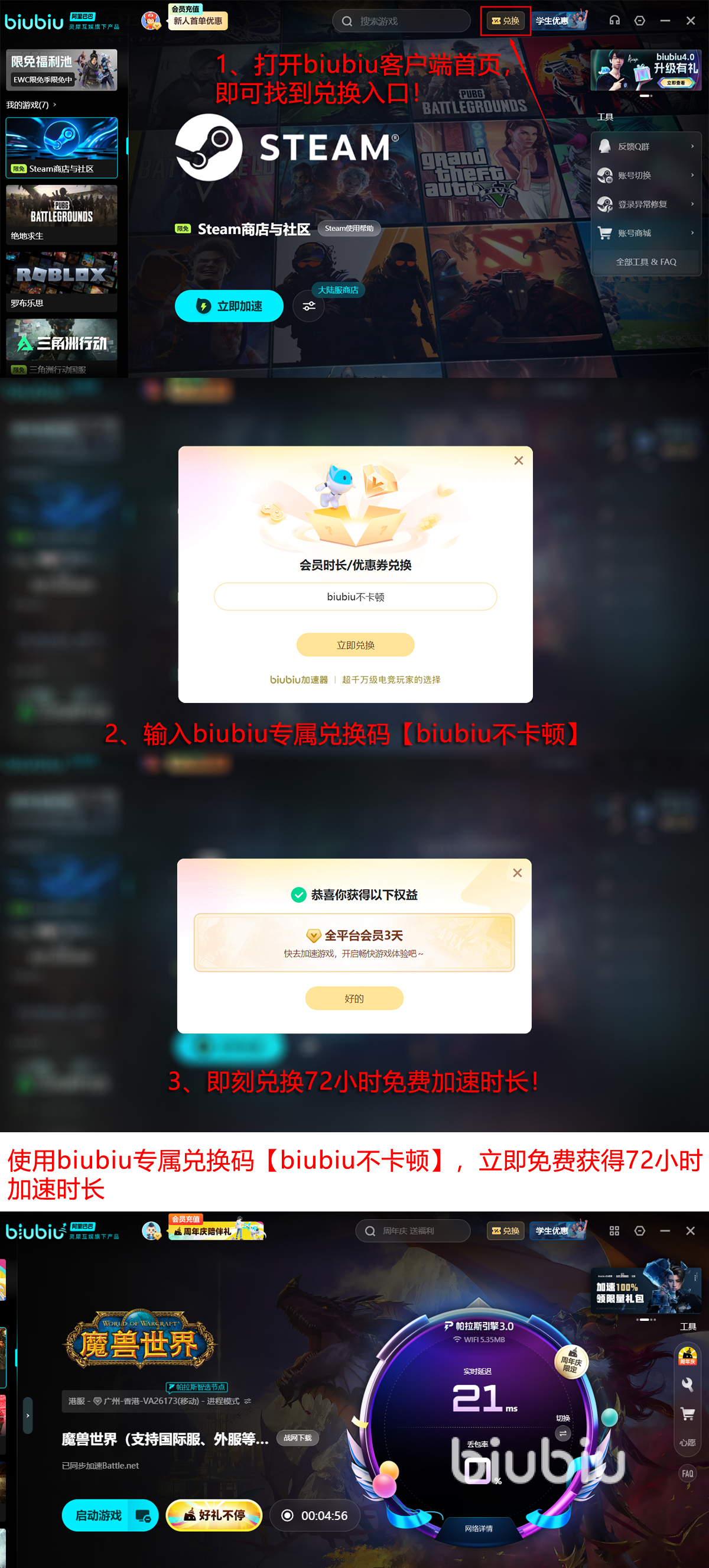 新用户注册后可立即领取新人可领取24H的免费加速权限,实测验证加速效果;所有用户输入专属兑换码【biubiu不卡顿】,即可额外获赠三日加速时长。累计最高可享96小时连续加速服务,满足多周目副本挑战、跨服战场拉锯及长线开荒需求。