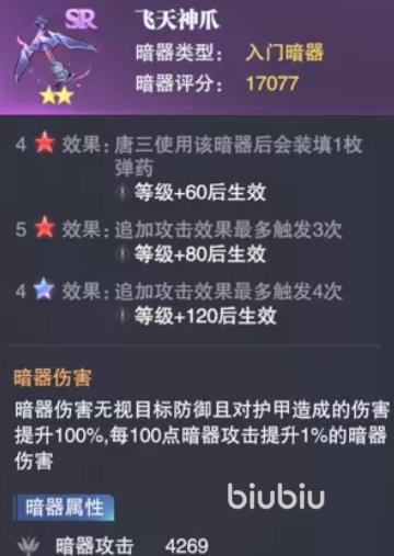暗器并非普通装备,而是融合角色等级、技能协同与战斗节奏的关键成长模块。以“飞天神爪”为例,该暗器初始即对唐三适配,具备明确的阶段性强化节点:角色等级达60级时,自动完成弹药装填;升至80级后,可触发三段连击;当等级突破120级,进一步解锁四次追击效果——每次命中均无视目标防御属性,即便对手装备高阶护甲亦无法减免伤害;且每次攻击还可叠加1%暗器专属伤害加成,形成持续增益循环。