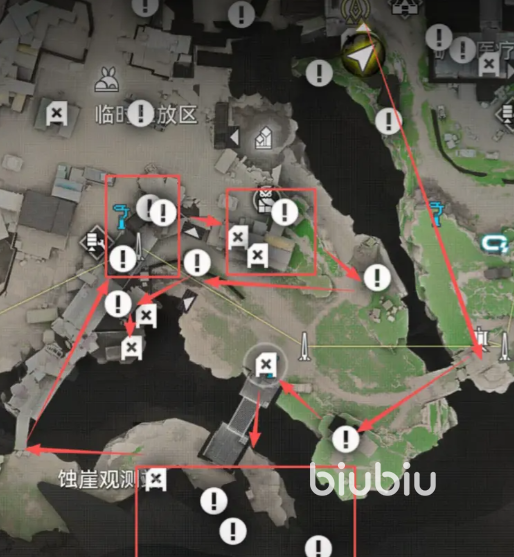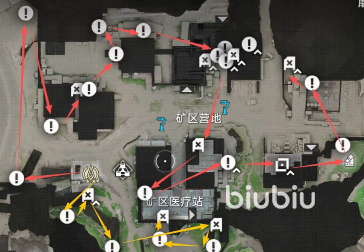 进入核心矿区后,资源密度明显提升。第二层高台边缘设有醚质12,视野开阔易于发现;第三层屋顶瞭望台区域配置醚质11,建议在沿楼梯上行过程中持续观察上方悬空平台与通风管道等高位结构。营地外围的矿脉通区为线性分布密集带,醚质9与醚质14均位于此区域,推荐从集装箱滑索起点切入,沿导引路径向内推进,可实现两点位连续获取。