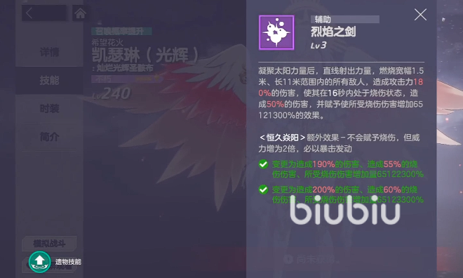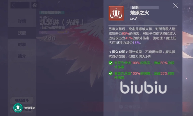 三技能【燎原之火】召唤火苗对单体目标造成95%攻击力伤害。若目标已处于灼烧状态,则额外提升凯瑟琳45%攻击力,并使其物理与魔法抗性各降低15%。值得注意的是,该减抗效果不适用于【恒久焱阳】状态下的目标;但在此状态下,【燎原之火】自身伤害仍提升2倍,确保爆发稳定性不受影响。