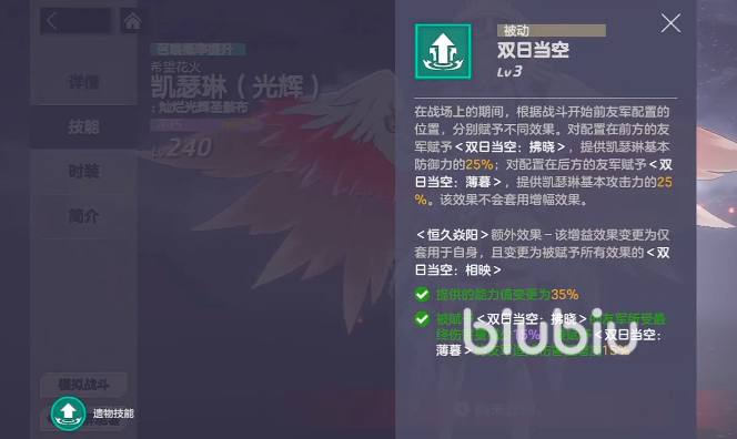 终极技【双日当空】根据队友站位差异化赋能:前排队友获得“拂晓”效果,防御力提升25%(基于凯瑟琳自身防御值);后排队友获得“薄暮”效果,攻击力提升25%(基于凯瑟琳当前攻击力)。此外,该技能本身可激活【恒久焱阳】,使凯瑟琳获得攻击力与防御力各+70%的双重增幅,并在本回合内恢复全部体力,实现攻防一体的质变式强化。