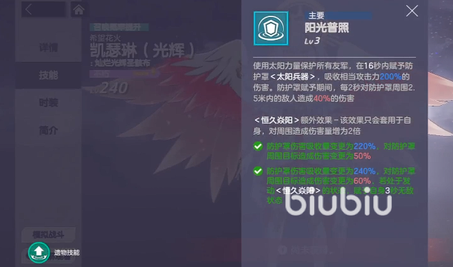 一技能【阳光普照】是凯瑟琳战斗循环的启动锚点。释放后立即为全体友方施加太阳兵器护盾,持续16秒。该护盾吸收量等同于凯瑟琳攻击力的200%,且具备主动反击机制:当敌方单位在护盾生效期间对任意友方造成伤害时,位于护盾半径2.5米内的所有敌人将承受相当于该次伤害40%的反伤。更关键的是,此次反伤必定触发【恒久焱阳】状态——该状态不仅使凯瑟琳自身伤害提升100%(即翻倍),当技能等级升至3级后,若护盾持续期间再次触发【恒久焱阳】,还将赋予凯瑟琳3秒无敌效果,极大强化其生存与续战能力。