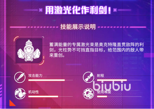 需注意的是,奥克特隆的操作门槛集中于节奏管理。激光发射存在明确蓄能周期,在此期间角色处于相对静止状态,易受敌方集火。因此实战中需严格遵循“开火—转移—再蓄能”操作循环:完成一次攻击后立即变更站位,规避弹幕覆盖区域,待安全距离重建后再启动下一轮输出。该机制虽不依赖多段连招,但对预判、走位时机与战场空间感知提出更高要求,使战斗兼具操作深度与策略张力。
