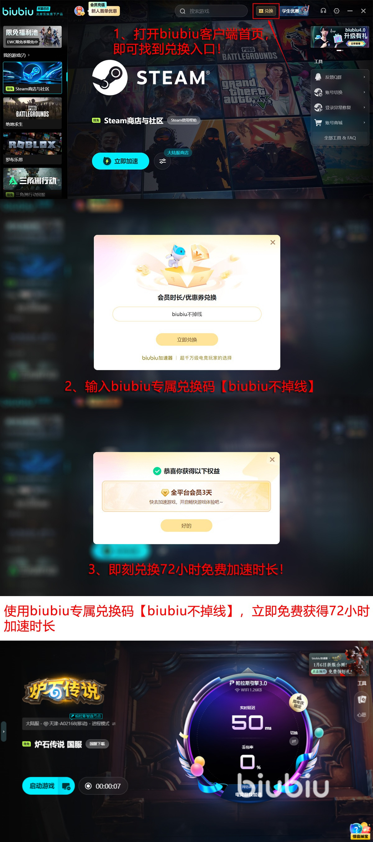 平台对新用户还推出了一系列极具吸引力的激励措施,新用户首次注册后,可立即获得无条件全功能免费试用24小时,输入【biubiu不掉线】并成功领取,继续重返酒馆战局享受72小时免费加速时长,整个流程简单快捷,新用户可以持续4天使用高级加速,避免炉石传说常见的卡顿和断线问题。