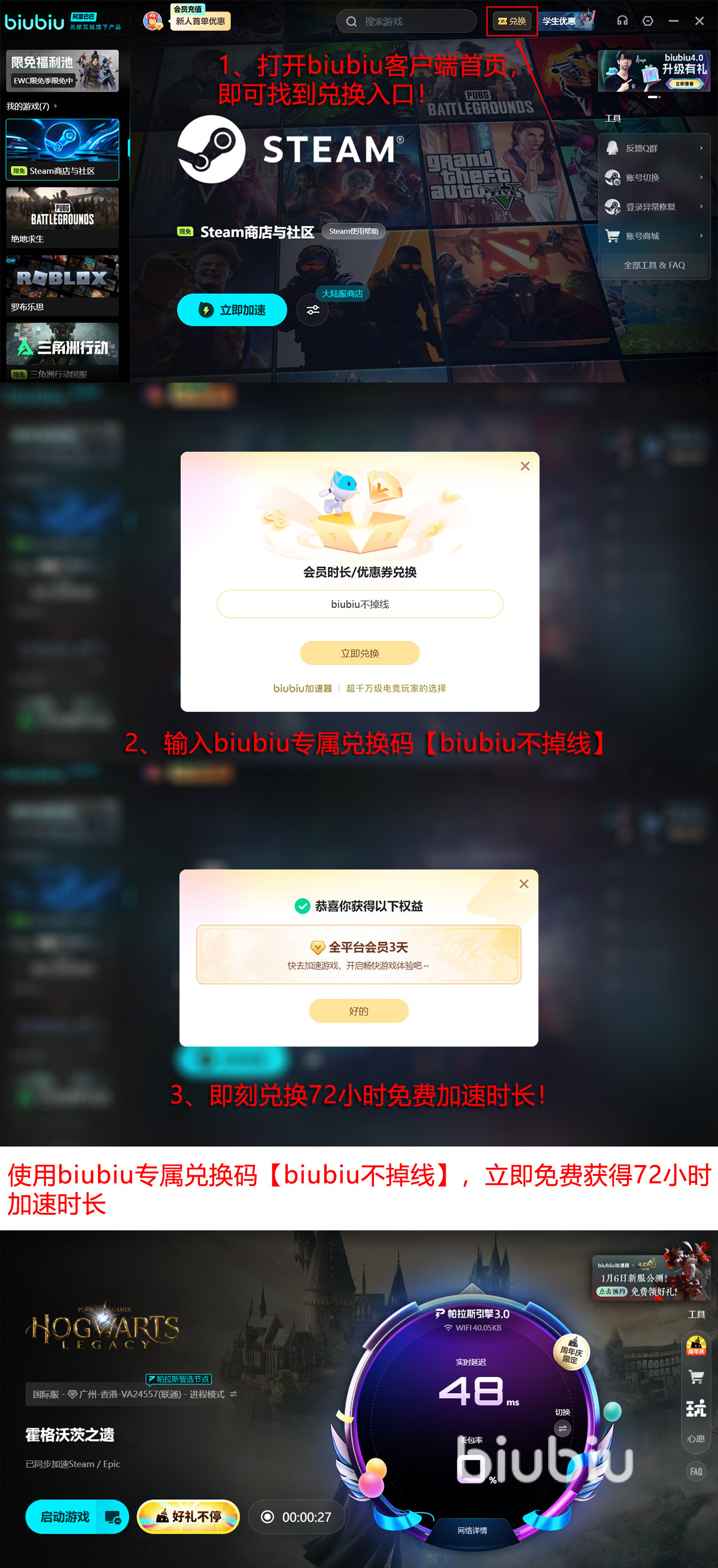 steam平台如今还享受biubiu的限免加速服务呢,同样的还有限免加速池当中的数款优秀制作,在12月18日到1月18日期间,大伙都能积极来找。新人优惠越多,注意领取新手礼包,包含24h服务时间,其次有【biubiu不掉线】作为额外优惠口令发放,拿来换就有72h得,新人就有96h了。