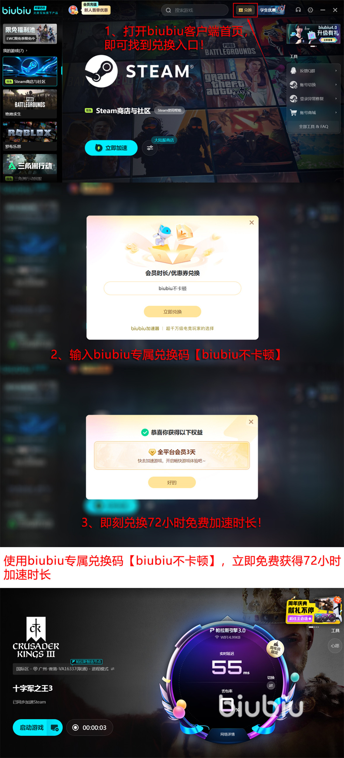 新用户注册即可获赠24小时免费加速时长;另可通过输入兑换码【biubiu不卡顿】额外领取72小时,总计达96小时体验额度。该兑换码支持所有账号(含历史注册账户)单次使用。后续如需持续使用,可选择连续包月或年费订阅,折合日均成本低于1元,性价比显著。