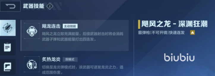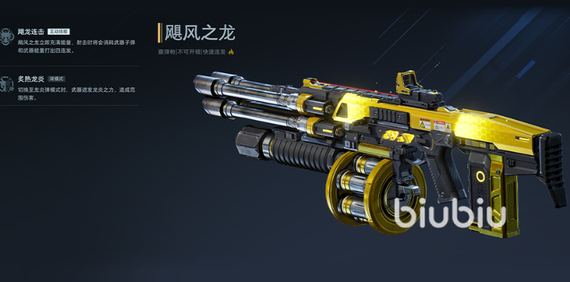 飓风之龙拥有两个核心技能:主动技“飓龙连击”与被动技“炙热龙炎”。开启主动技后,每次扣动扳机将自动完成四连发,无需持续按压;而被动技则支持形态切换——进入龙炎弹模式后,前置弹夹容量变为1发,后置弹夹为15发,每发射击均需单独装填。若在主动技激活状态下切换至龙炎弹,前置弹夹可额外提升至4发,后置弹夹相应调整,总弹量保持恒定。