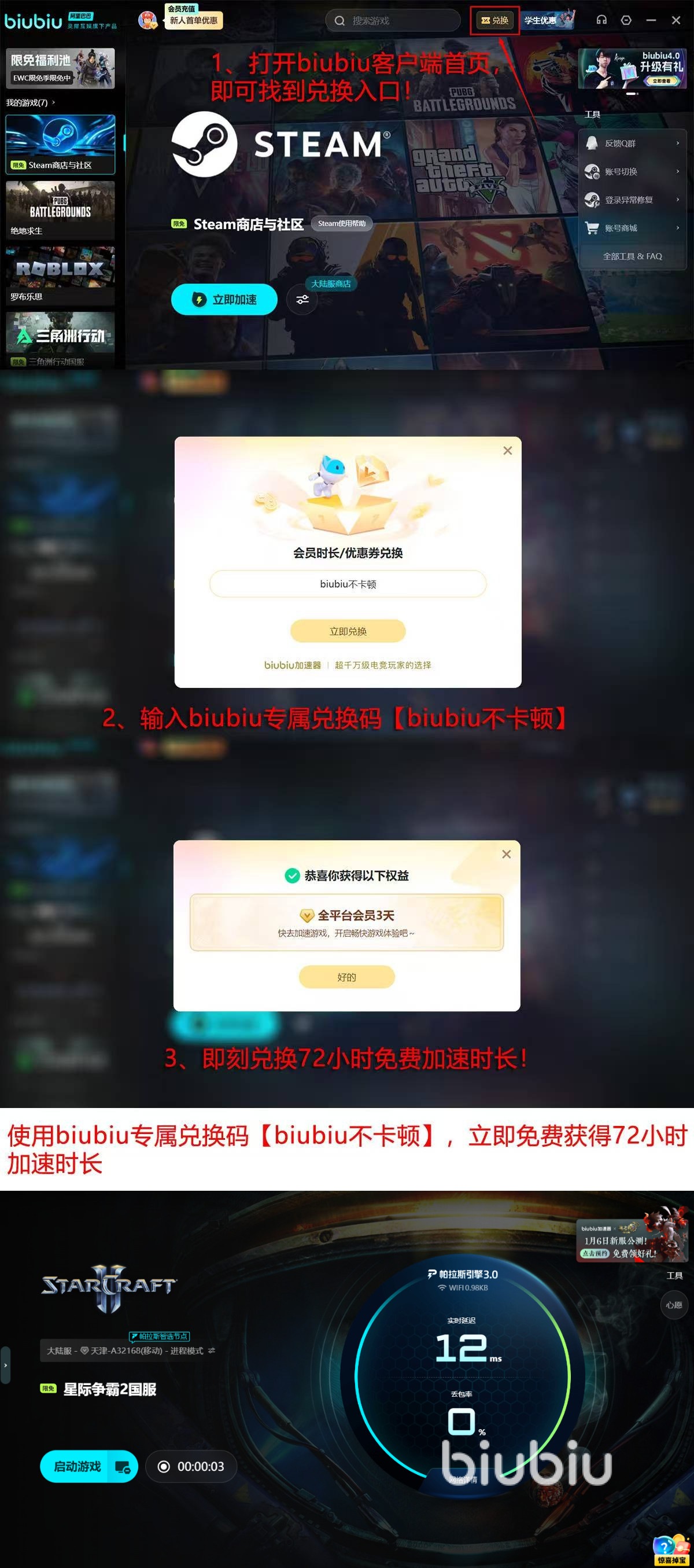 biubiu加速器基于用户需要开展调研,对于新用户推出首次注册即赠送无条件专属加速24小时,输入【biubiu不卡顿】赠送72小时极速服务,总共四天,让用户满足各方面对快速稳定网络的需求。