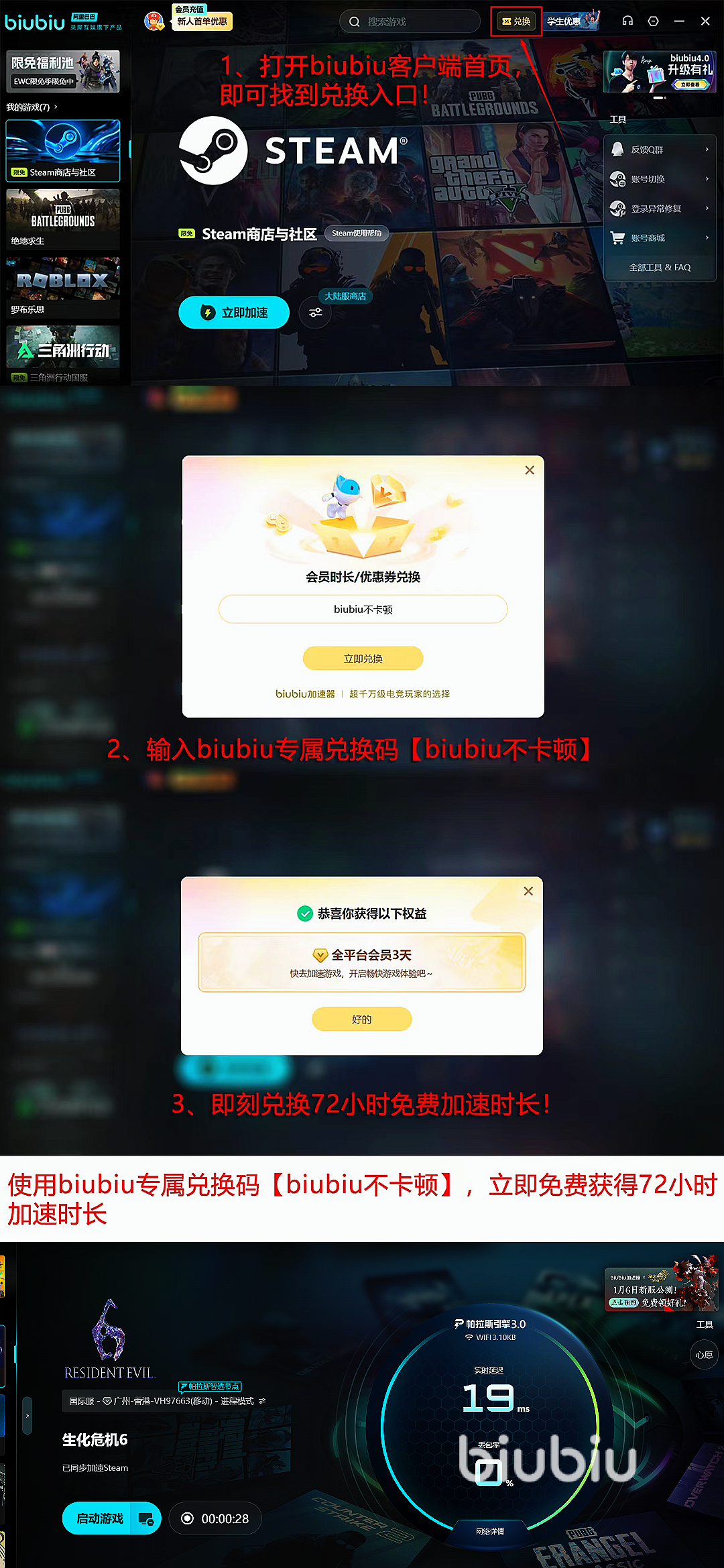 biubiu的功能丰富且多彩,很多用户使用的体验都是很赞的,而且新用户方面还能享受额外的加成,只要是新用户注册就能直接解锁24 小时全场游戏免费加速特权,同时新老用户输入兑换码【biubiu 不卡顿】就能额外再领 3 天免费加速时长。