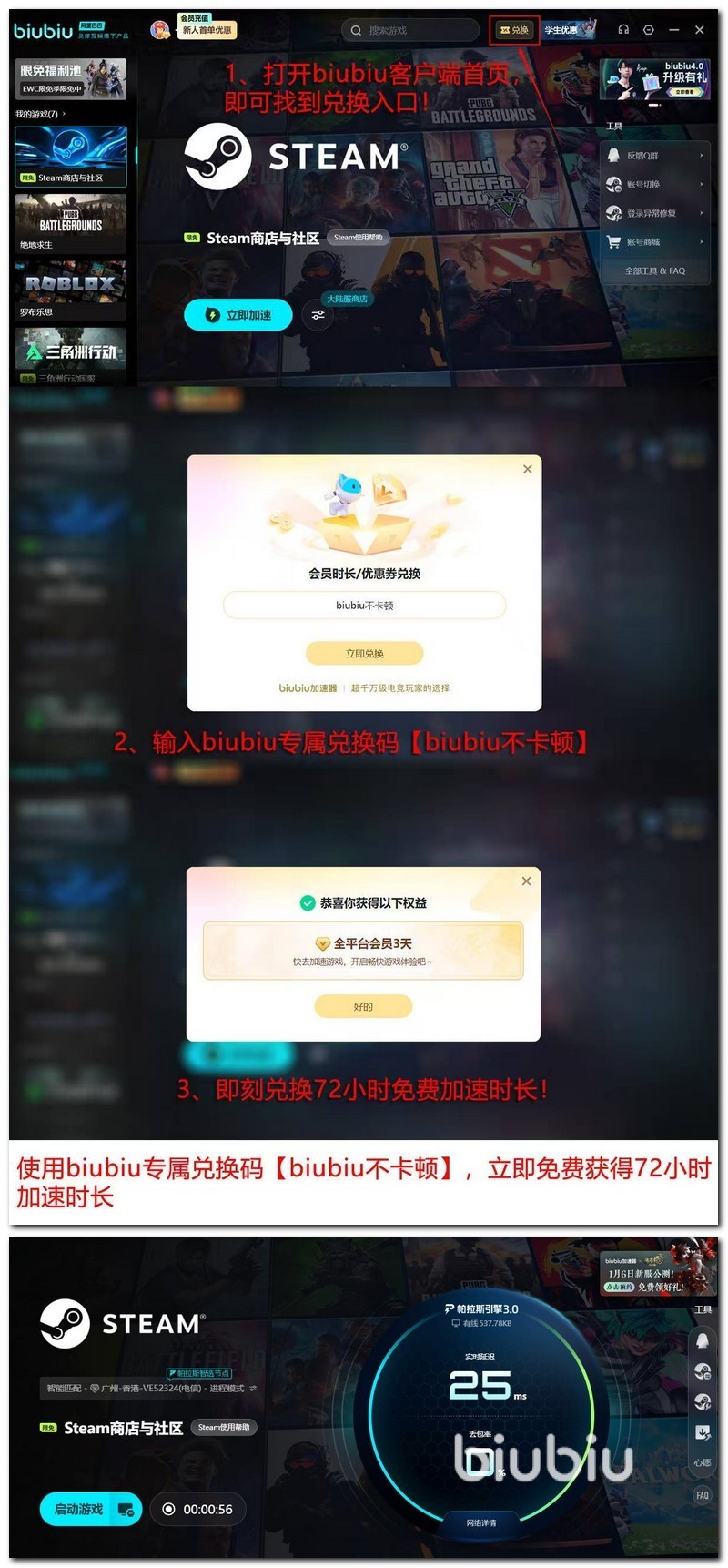 现在biubiu还为广大用户提供了很多福利,新用户注册之后就能自动领取24h的免费加速福利,担心24小时不够用?没关系,还有福利兑换码【biubiu不卡顿】这是为新老用户准备的,在指定窗口输入后就可以兑换72小时的加速时长,这样对新人来说两种福利叠加在一起就是96小时,足足4天的免费加速体验时长了,这是很多同类产品都无法给到的,biubiu有这个底气,也是对自己的产品有充足的信息。