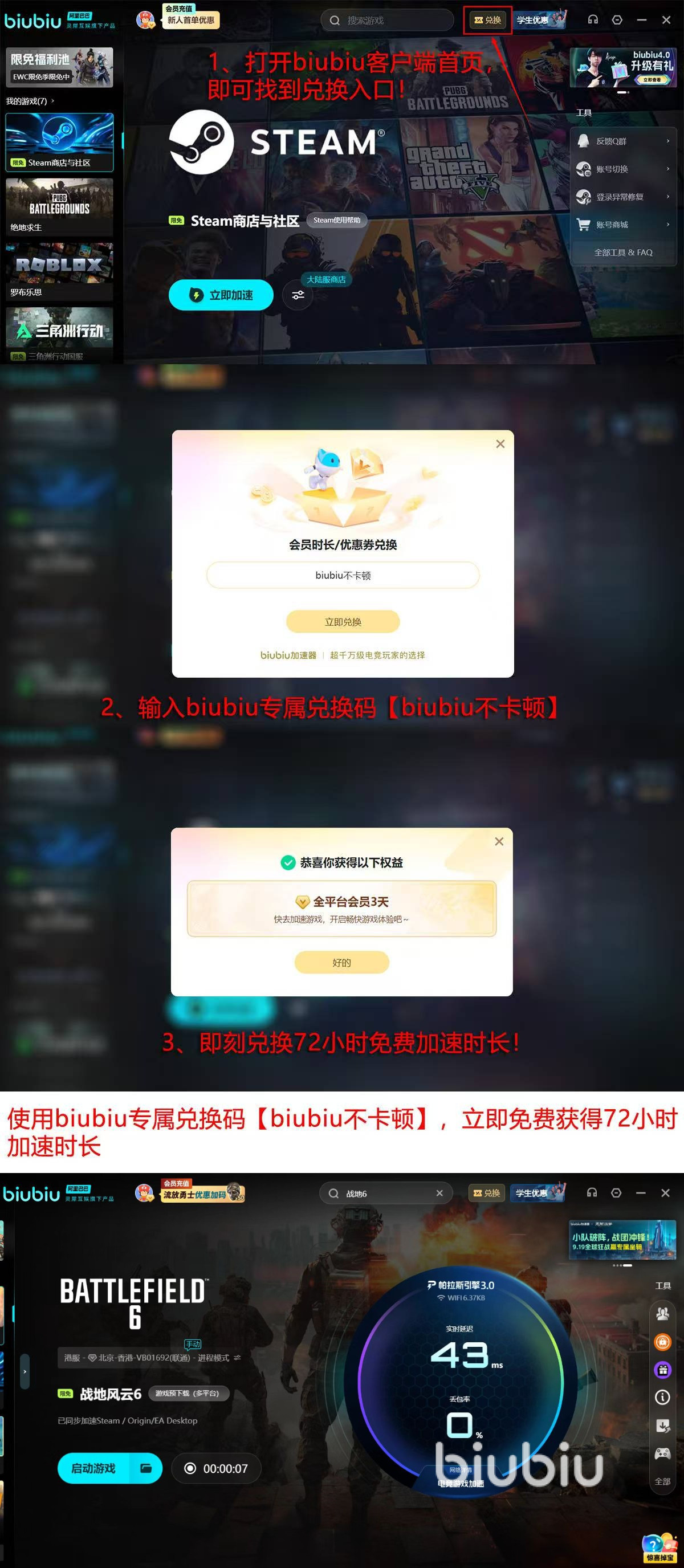 biubiu加速器平台开始实施针对新用户的特别福利计划,新注册用户均可获得全天候高速服务权益24小时,输入【biubiu不卡顿】还将额外获得稳定性能保障72小时,总计96小时优先加速时长。