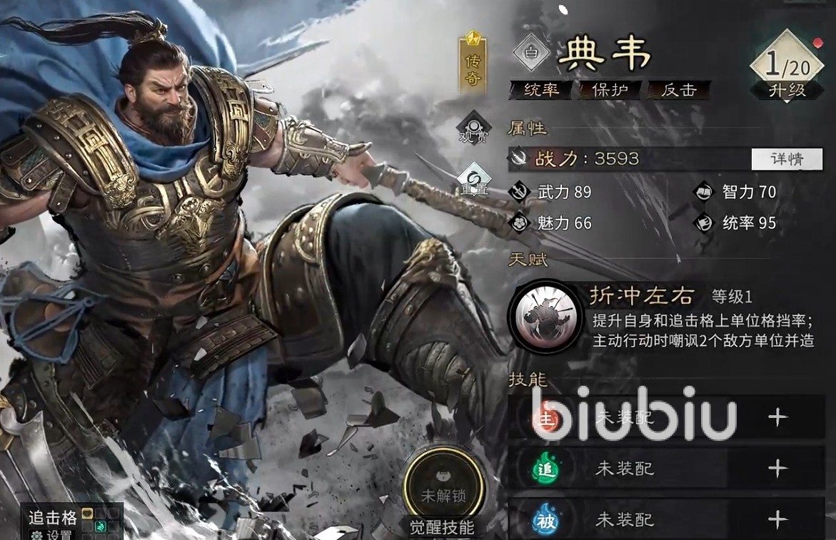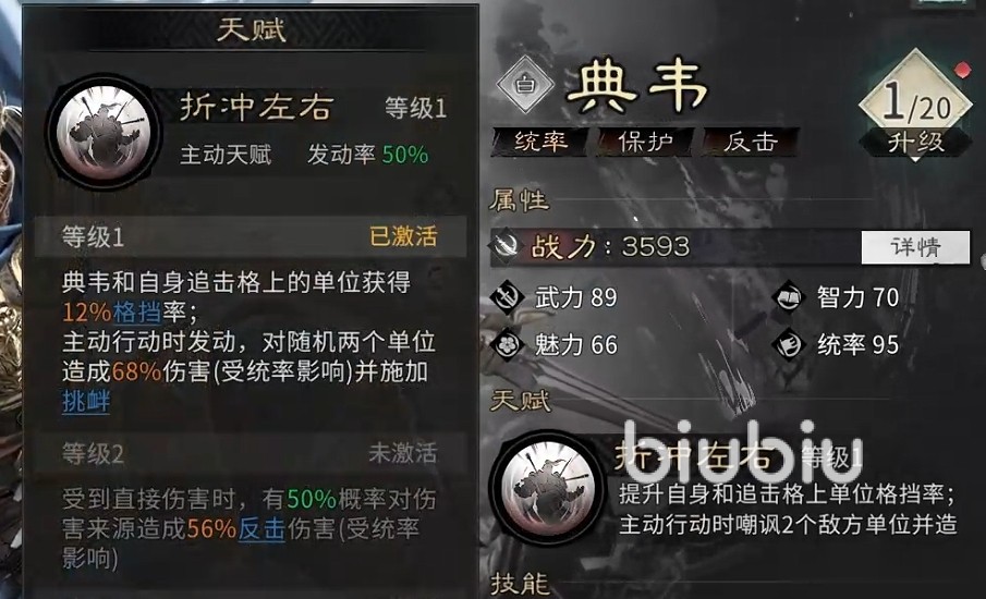 典韦的基础机制围绕“格挡”与“反击”展开。其天赋可同步提升自身及追击格上友军的格挡率,显著增强前排容错空间;主动技能则对两名随机敌方目标造成伤害并附加挑衅效果,有效干扰敌方输出节奏。当技能升至二阶后,典韦在承受伤害时将有概率立即对伤害来源发起一次反击,进一步强化其反制能力。整体定位明确:以承伤、控场、增益三位一体,为核心输出提供坚实屏障。