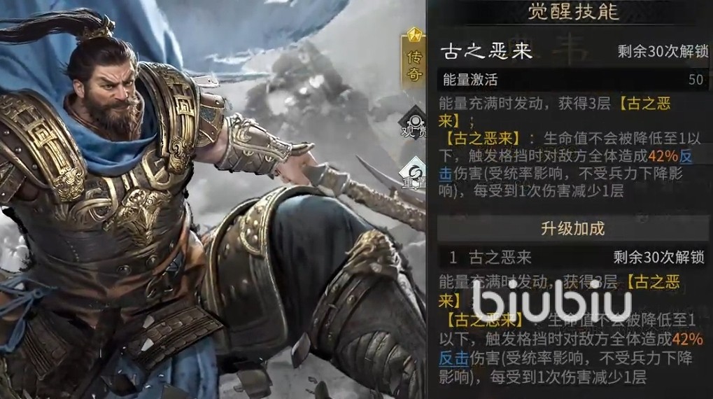 完成觉醒后,典韦解锁核心技能“古之恶来”。该技能在能量满时自动叠加三层,每次受击消耗一层。关键在于:只要层数存在,典韦生命值不会低于1点,实现实质性的“不死”保护;且每次成功格挡后,将对敌方全体触发一次反击伤害,该效果不消耗层数,可高频连续触发,极大提升群体压制力与持续作战能力。