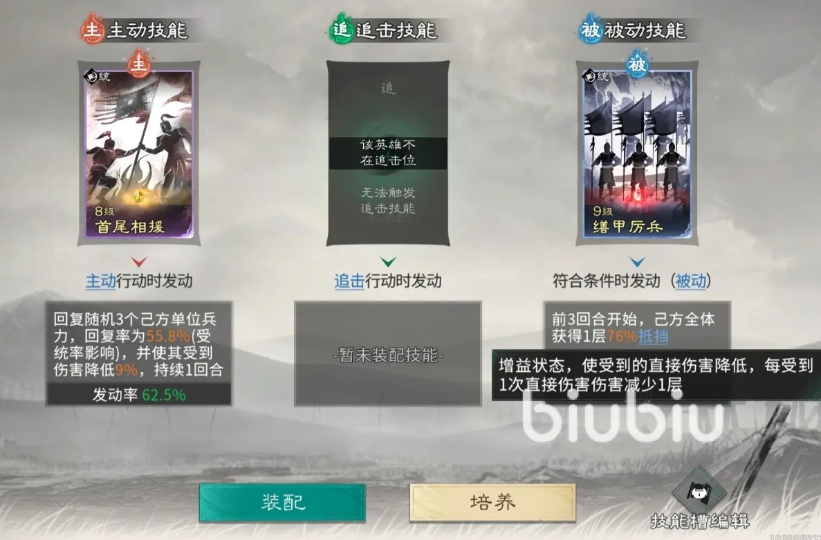 在阵容搭配方面,典韦与赵云、甄姬组成的反击流组合表现尤为突出。赵云置于典韦追击格内,可触发双次追击,配合典韦提供的格挡率加成,大幅提升其站场稳定性;同时典韦自身具备可观追击输出,有效分担主C压力。技能配置上,主动技推荐选择“首尾相援”,为己方单位恢复兵力并降低所受伤害;被动技适配“缮甲厉兵”,为全队提供抵挡效果,全面压缩敌方有效输出窗口,显著优化整支队伍的生存阈值。