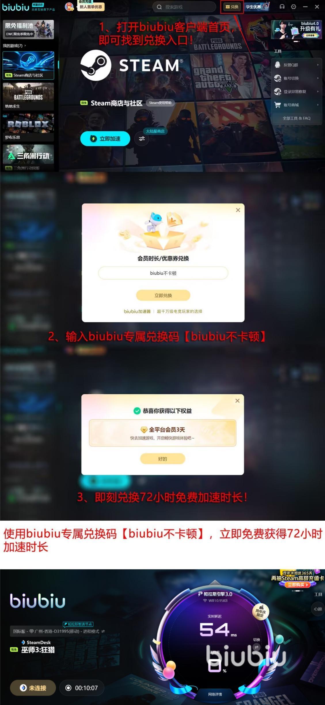 而且对于新用户来说,现在是一个加入biubiu的好时机。新用户只需在biuibiu完成注册,便可以获得一天的免费体验时长,先体验才可以知道是否适合自己。同时不管新老用户,只需将兑换码【biubiu不卡顿】输入进biubiu,即可获得三天的免费时长。总的来说,如果你是biubiu的新用户,各种活动可以获得96小时的体验时长!