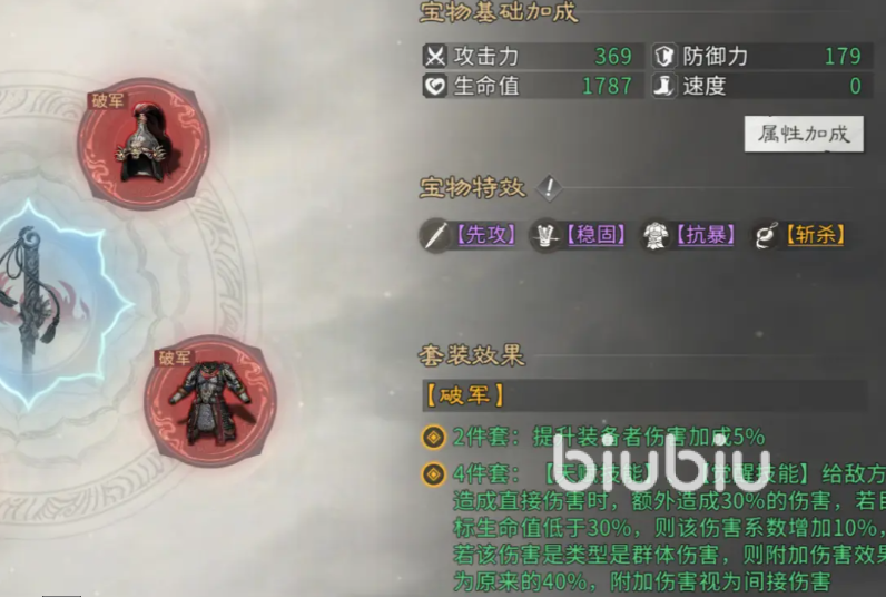 觉醒资源应优先投入吕布。觉醒后其单体伤害获得质变提升,可大幅缩短敌方减员周期,提前开启收割阶段,在多数对局中具备战术主导权。宝物搭配上,吕布主推【破军】四件套:两件套提供5%基础伤害加成,并额外附加30%固定伤害;当目标生命值低于30%时,再额外提升10%伤害——此效果与追击高频触发特性高度契合,专为终结阶段优化。副属性需重点强化暴击率与穿透率,最大化瞬时爆发上限。