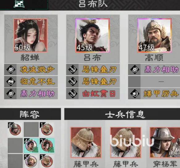 阵容结构以吕布为绝对主C,高顺与貂蝉双辅协同。高顺需确保统帅属性全面高于敌方全体武将,从而稳定提供追击增益;貂蝉则依赖魅力属性压制对手,二者共同构成追击触发的基础条件。因此,必须为其配备能快速堆叠对应四维属性的高品质宝物,以保障机制稳定生效。兵种配置推荐藤甲兵×2+穿杨军×1:藤甲兵强化防御韧性,提升前排持续作战能力;穿杨军则显著提高物理穿透,放大吕布单体伤害的实际转化效率。技能方面,吕布首选【白虹贯日】,该技能不仅强化首次攻击爆发,更能有效联动追击机制,提升整体单体斩杀节奏。