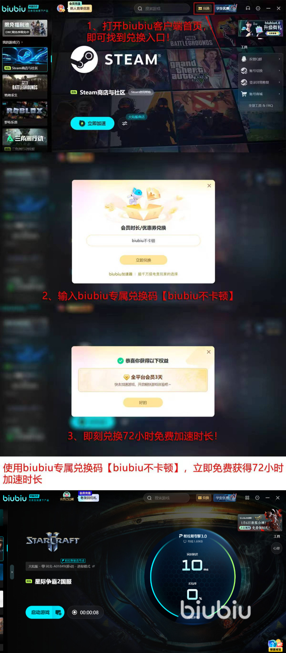 biubiu加速器可是有着阿里巴巴灵犀互娱做技术兜底,技术水平是遥遥领先的哦。而且在诚意和自信方面更是远远超出其他平台,比如它的新人福利是超级给力呦。首次注册直接送24小时免费加速,biubiu的加速效果直接让你体验一番!当体验过后无人不为它称赞哦。要是觉得光是体验了星际,还没来得及再试试其他游戏的提速效果,为此觉得遗憾。别担心,继续输入专属兑换码【biubiu不卡顿】,还能额外薅到72小时免费加速,加起来是直接凑够了4天的免费体验。反正是免费的,不试白不试!