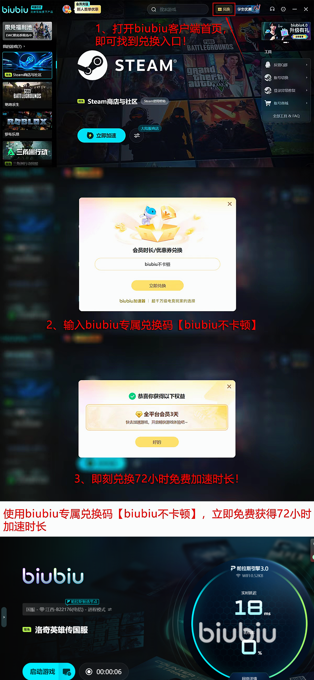 而且很多玩家在使用以后,对于biubiu的功能以及性能都给出了不错的评价,新手玩家也同样喜欢biubiu,因为新人注册biubiu都可以获得24小时免费加速,使用兑换码【biubiu不卡顿】可获3天免费的使用权哦,也就是说拥有96小时的免费时间,老用户同样也是能享受通过兑换码领取福利。