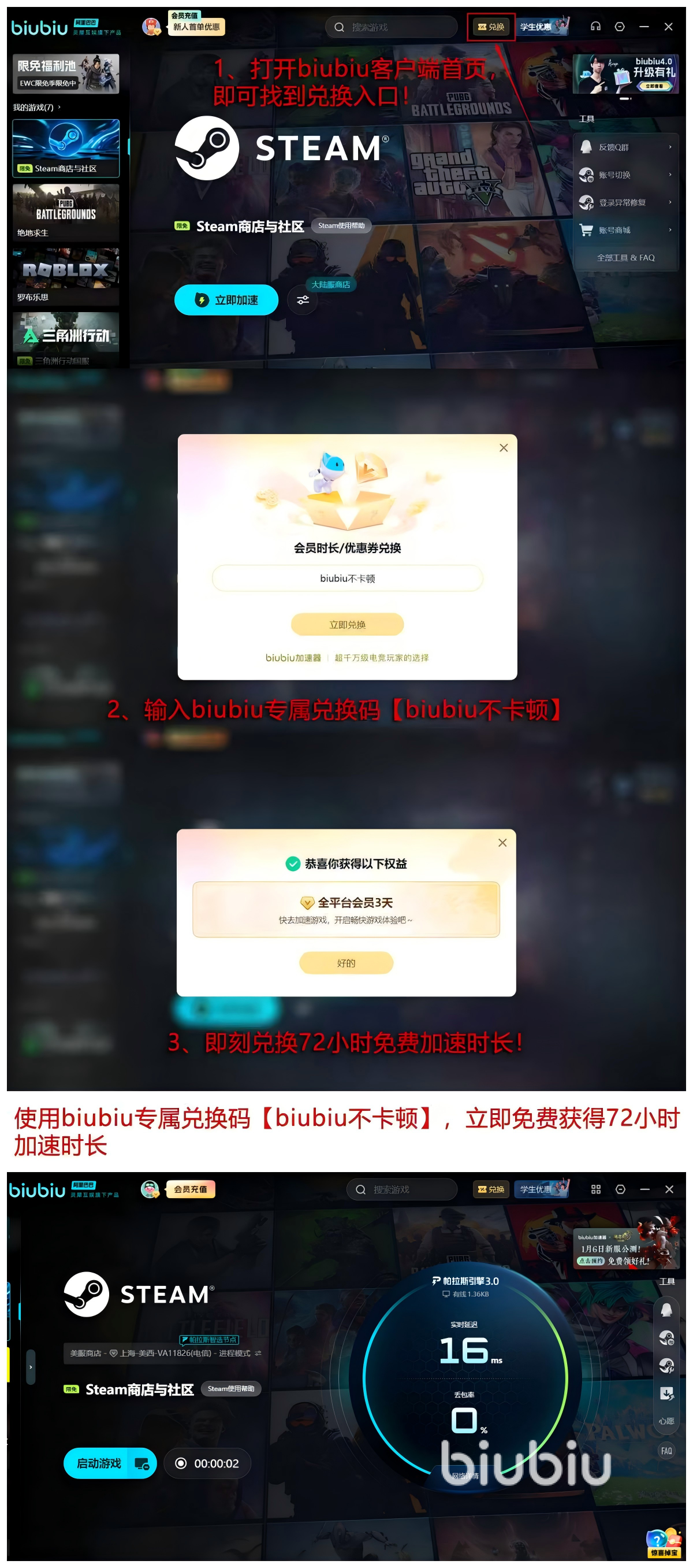 【biubiu不卡顿】口令了解一下,领取72小时加新用户24小时总计获取96小时时间,时间方面的免费对于各位来说是非常的多的足足可以全功能体验四天,要是有什么热门的想要参与游玩这些时间基本上就是绰绰有余了。