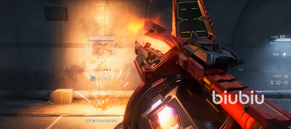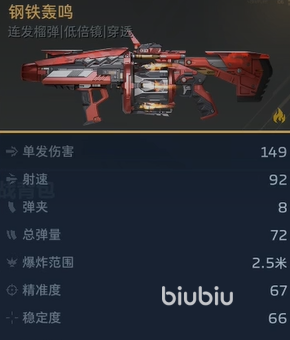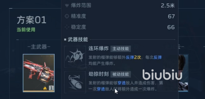 基础属性方面:单发爆炸伤害为149点,理论射速92发/分钟,弹匣容量13发,总携弹量72发,爆炸半径2.5米;精准度67,稳定度66。单纯看纸面数据,它并不属于高精度或高控场型武器,但两项核心机制彻底重构了其战术定位:主动技能【连环爆炸】使投射榴弹具备最多2次物理反弹能力,且每次反弹均触发完整爆炸判定;被动技能【劫掠时刻】则赋予榴弹穿透特性——首次命中敌人时不仅造成穿甲伤害,还会额外触发一次独立爆炸效果。