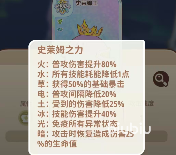 其核心竞争力源于专属特性:当队伍中存在其他属性不同的史莱姆时,史莱姆王将获得显著增益。例如,若编队内含火属性史莱姆,其普通攻击伤害将提升80%。该效果非装饰性设定,而是可稳定触发、直接作用于输出循环的关键机制。