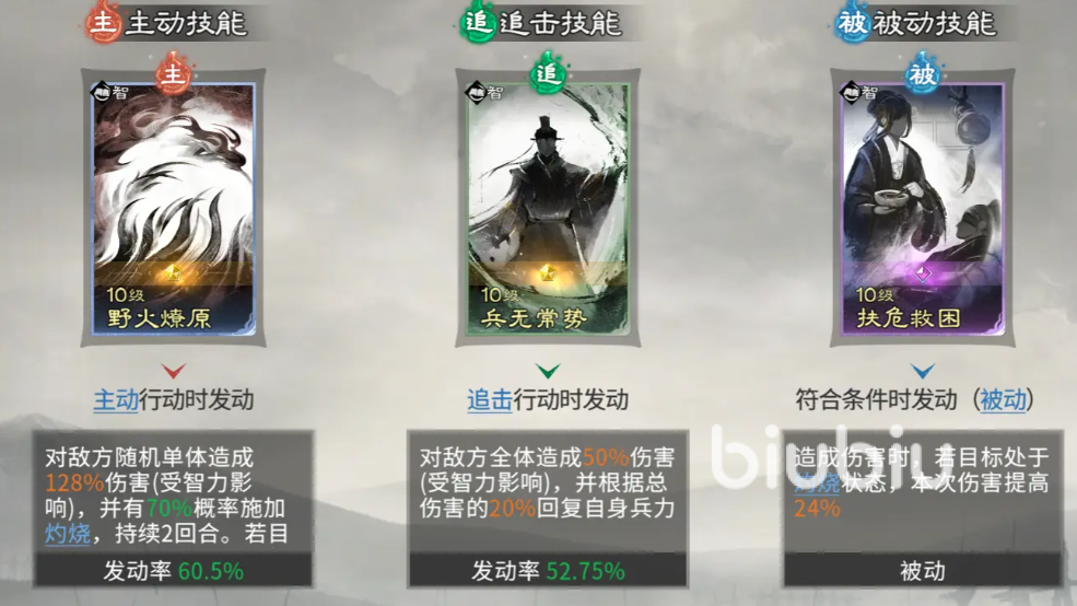 技能卡选择上,主推“野火燎原”——该卡具备扎实的单体伤害基础,并拥有70%的灼烧层数叠加概率。连续释放三次后,触发频率达到峰值,大幅提升灼烧覆盖率与斩杀节奏。追击类技能可选用格子类效果,契合队伍无专职辅助、依赖武将自主联动的特性,保障战斗续航稳定性。
